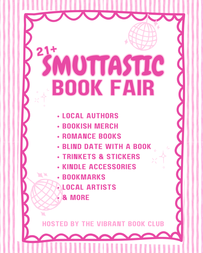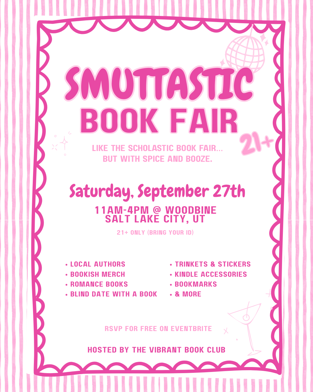 The first Smuttastic Book Fair was so amazing, The Vibrant Book Club decided to do it again, only bigger and better! Join me plus 30+ other local authors, artists, and bookish vendors for a day of adult book fun.