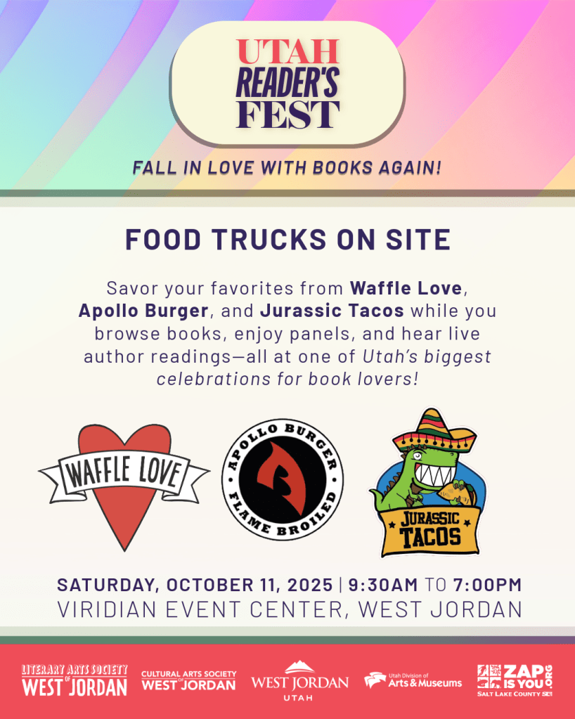 There is a book drive to help support the West Jordan education programs. Visit the food trucks for yummy treats. Yours truly will be doing a reading at 7pm.